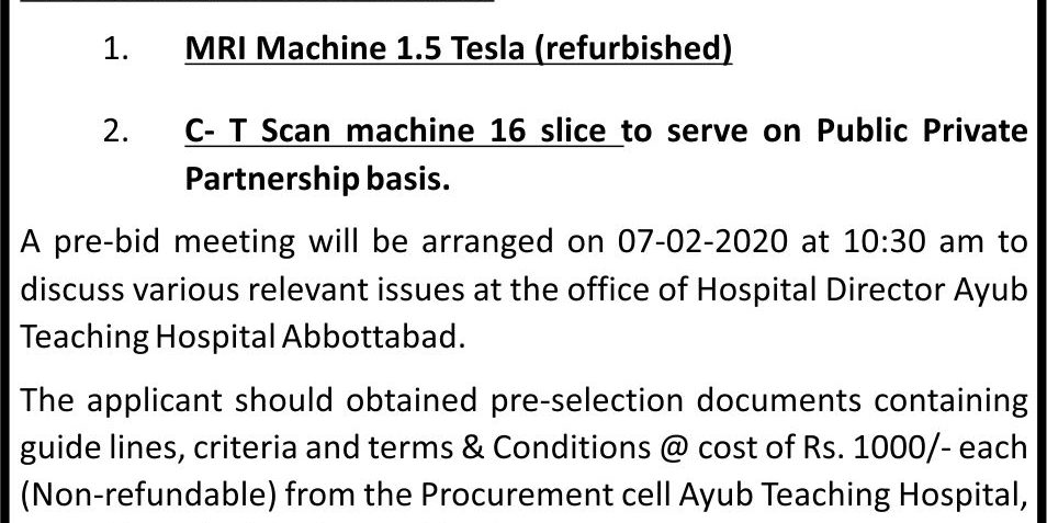 Download Documents Here… Pre-Selection Document for the installation of CT Scan Machine Pre-Selection Document for the installation of MRI Suit Category: tendersBy athFebruary 4, 2020 Author: ath Post navigationPreviousPrevious post:Up gradation and Renovation (Civil Electrical and HVAC Work) of operation Theater at Ayub Teaching HospitalNextNext post:Sealed and postal tenders are invited to ATH for the 2019-2020Related PostsPrebid Meeting Minutes for the Tender of Lab Chemical Reagents on Rental BasisApril 3, 2026Minutes of Pre-Bid Meeting of Electro-Medical EquipmentApril 2, 2026Request for Quotation for Different Miscellaneous itemsMarch 27, 2026Bids are Invited from Firms / Bidders for Different Works & Items (Family Park, Lab Chemicals, Electro-Medical Equipment, Photostat Shop and Many More)March 23, 2026Request for Quotation for Repair of Air Compressor Dryer-IMarch 16, 2026Technical Evaluation Report Regarding Tender of Construction of Family ParkMarch 7, 2026