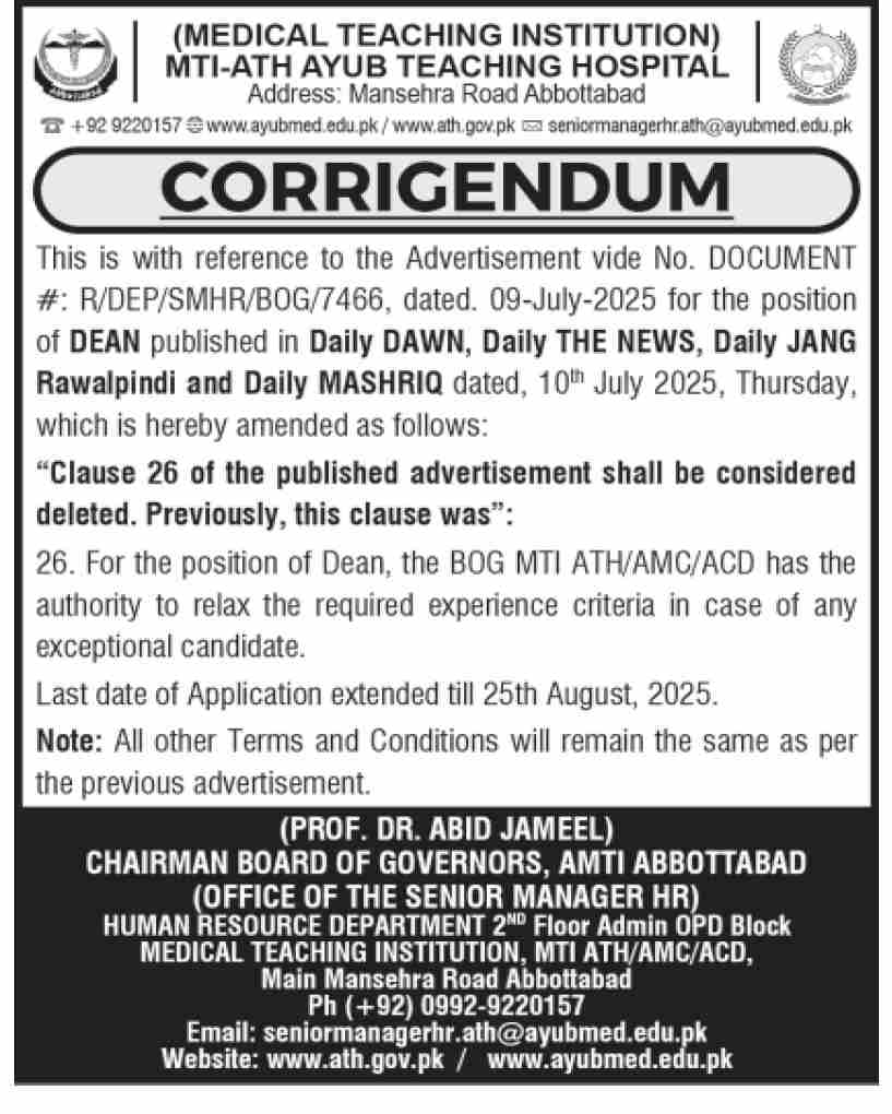 Applications are invited from suitable candidates for the Post of Medical Director ATH AbbottabadOctober 1, 2025