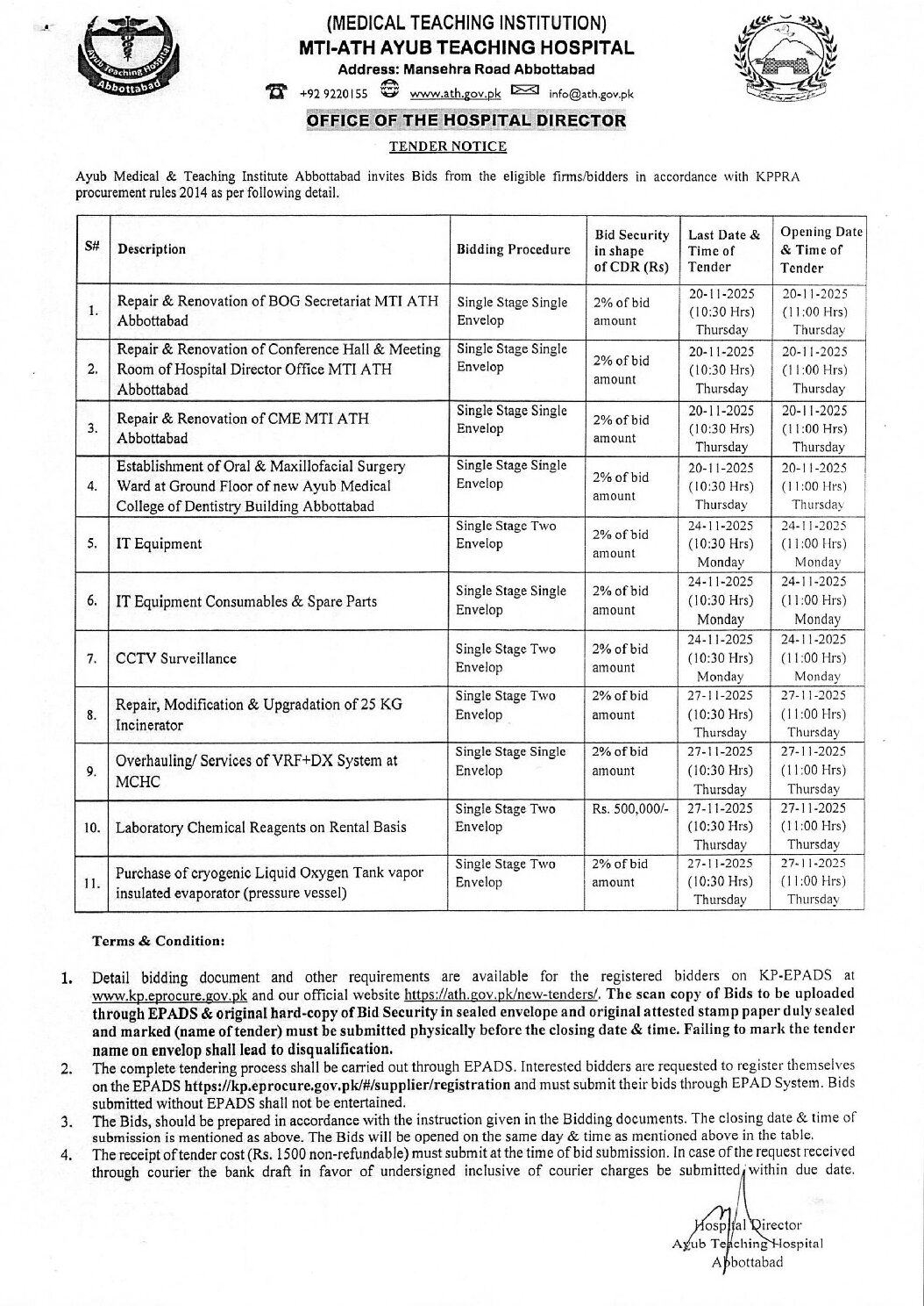 ATH invites bids for the Tender of Civil Works, IT Equipment & Consumable, CCTV, Repair/Modification of Incinerator, Servicing of VRF+DX System, Purchase of Cryogenic Oxygen tank and Lab Chemical Reagent on Rental Basis