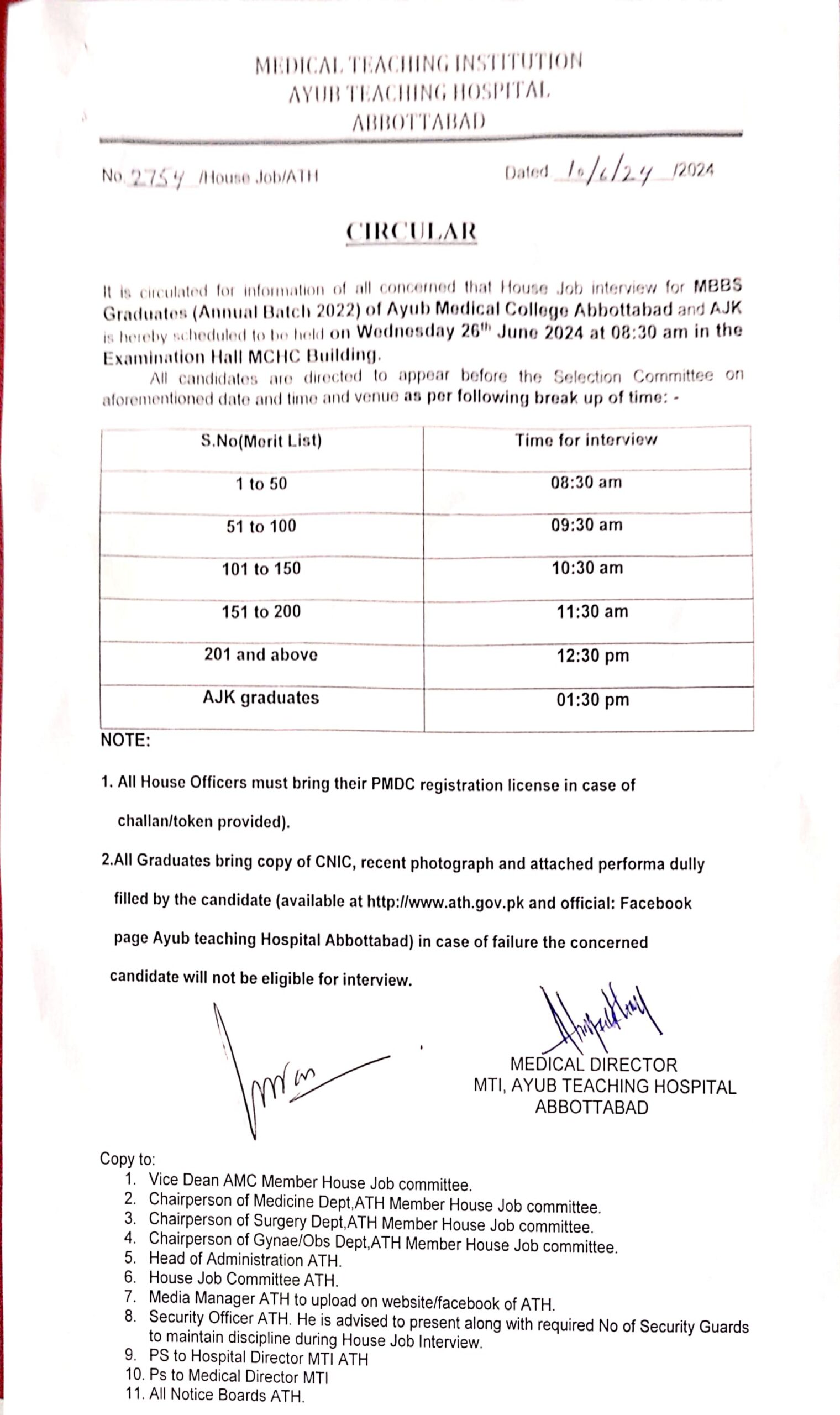 House Job interview for MBBS Graduates (Annual Batch 2022) of AMC and AJK