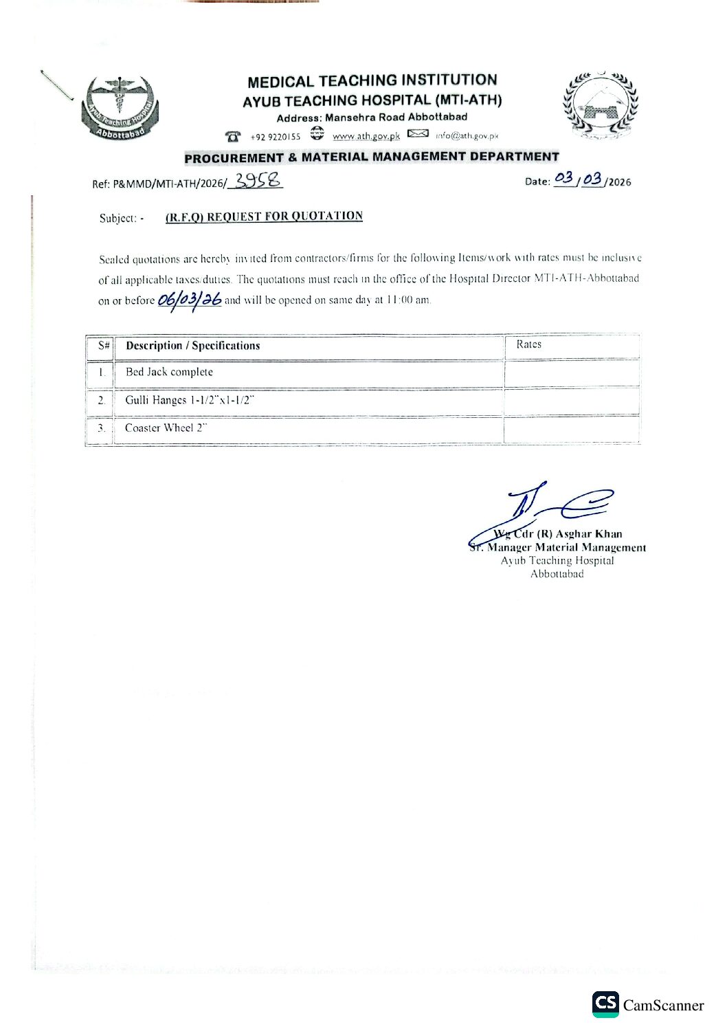Category: tendersBy athMarch 3, 2026 Author: ath Post navigationPreviousPrevious post:Request for Quotation for Silicon Gun & Glass CatcherNextNext post:Request for Quotation for Spare Works of Seater A-1033, Ambulance A-1520 & Mini Ambulance (Rickshaw)Related PostsPrebid Meeting Minutes for the Tender of Lab Chemical Reagents on Rental BasisApril 3, 2026Minutes of Pre-Bid Meeting of Electro-Medical EquipmentApril 2, 2026Request for Quotation for Different Miscellaneous itemsMarch 27, 2026Bids are Invited from Firms / Bidders for Different Works & Items (Family Park, Lab Chemicals, Electro-Medical Equipment, Photostat Shop and Many More)March 23, 2026Request for Quotation for Repair of Air Compressor Dryer-IMarch 16, 2026Technical Evaluation Report Regarding Tender of Construction of Family ParkMarch 7, 2026
