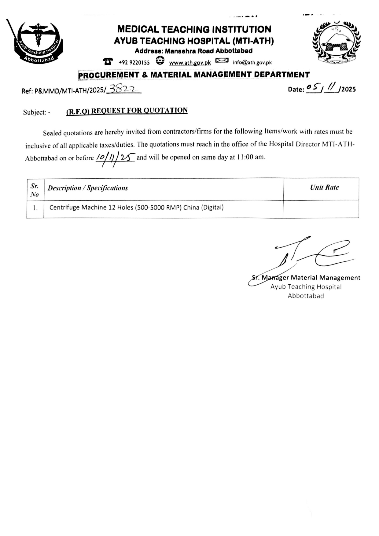 Category: tendersBy athNovember 7, 2025 Author: ath Post navigationPreviousPrevious post:Request for Quotation for Repair & Upgradation of Digital Surveillance SystemNextNext post:Request for Quotation for Toner 151ARelated PostsRequest for Quotation for Quartz Heater (SECO GM CLIMAX) Model SG-690December 12, 2025Request for Quotation for Bottom for Gas Geyser 18″, Regmaal Disc 4″December 10, 2025Request for Quotation for Flare Nuts for Air ConditionersDecember 10, 2025Request for Quotation for Steel Wire 3″, Acid, Disposable Safety Mask, Shovels, Pickaxes, Rope (Nylon), Suction Pump, Protective Clothing, BarsatiDecember 10, 2025Request for Quotation for AC & DC Relay for BMS AHU No.4December 10, 2025Request for Quotation for Looking Mirror 5mmDecember 10, 2025