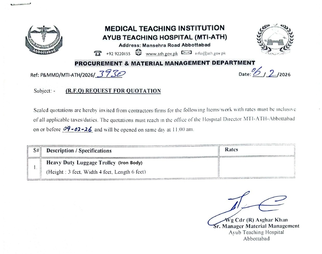 Category: tendersBy athFebruary 6, 2026 Author: ath Post navigationPreviousPrevious post:Request for Quotation for Crash Carts (Plastic Body) ImportedNextNext post:Request for Quotation for Mobile OilsRelated PostsPrebid Meeting Minutes for the Tender of Lab Chemical Reagents on Rental BasisApril 3, 2026Minutes of Pre-Bid Meeting of Electro-Medical EquipmentApril 2, 2026Request for Quotation for Different Miscellaneous itemsMarch 27, 2026Bids are Invited from Firms / Bidders for Different Works & Items (Family Park, Lab Chemicals, Electro-Medical Equipment, Photostat Shop and Many More)March 23, 2026Request for Quotation for Repair of Air Compressor Dryer-IMarch 16, 2026Technical Evaluation Report Regarding Tender of Construction of Family ParkMarch 7, 2026