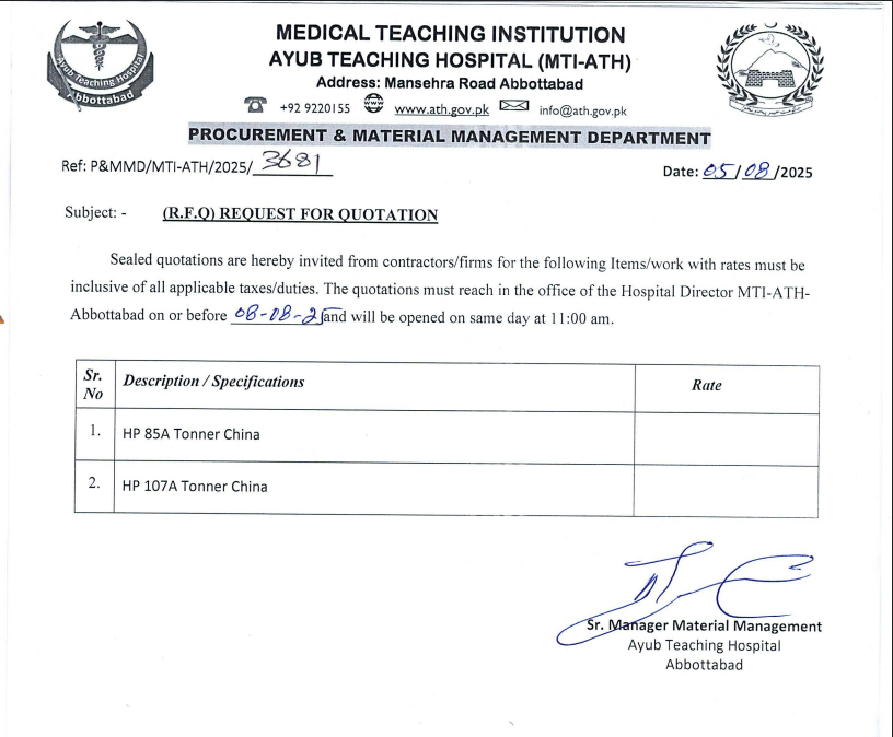 Category: tendersBy athAugust 6, 2025 Author: ath Post navigationPreviousPrevious post:Request for Quotation for Iron Stretcher Top Frame Round Pipe 18swgNextNext post:Request for Quotation for 80A, 37A and 147A Tonner’sRelated PostsRequest for Quotation for Paper Delivery Rollers for HP 1102/1109/12a PrintersApril 9, 2026Request for Quotation for Repair & Overhauling of Washer Extractor No. 2April 9, 2026Prebid Meeting Minutes for the Tender of Lab Chemical Reagents on Rental BasisApril 3, 2026Minutes of Pre-Bid Meeting of Electro-Medical EquipmentApril 2, 2026Request for Quotation for Different Miscellaneous itemsMarch 27, 2026Bids are Invited from Firms / Bidders for Different Works & Items (Family Park, Lab Chemicals, Electro-Medical Equipment, Photostat Shop and Many More)March 23, 2026