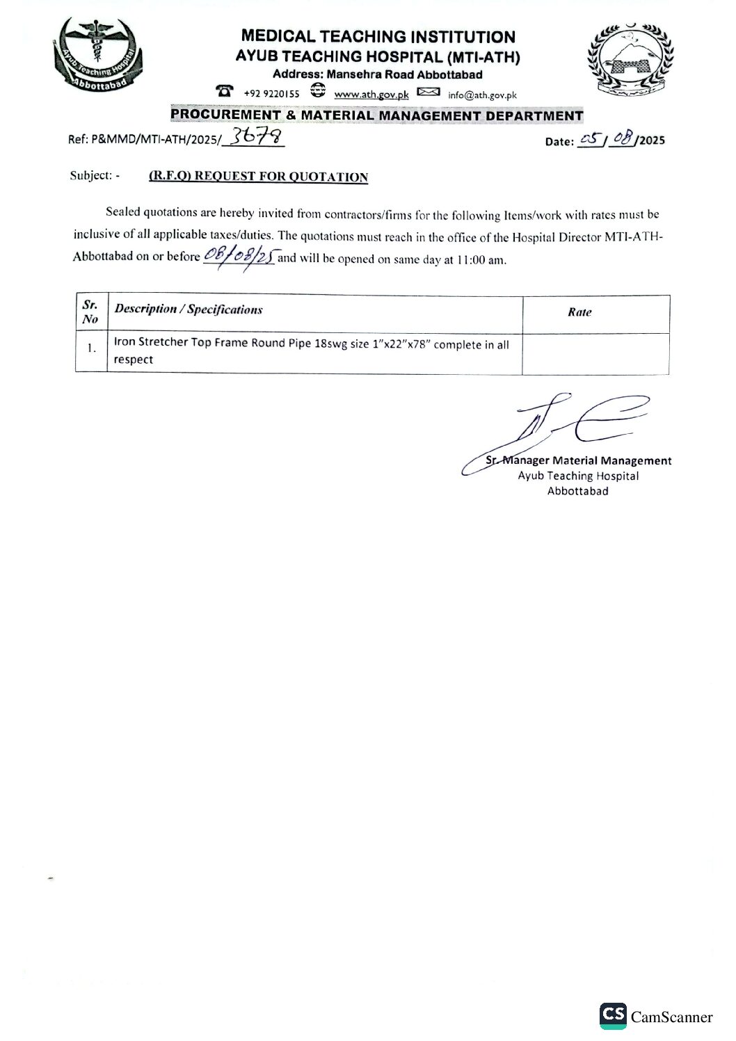 Category: tendersBy athAugust 5, 2025 Author: ath Post navigationPreviousPrevious post:Request for Quotation for Different Printer ItemsNextNext post:Request for Quotation for HP 85A and 107A Tonner’sRelated PostsRequest for Quotation for Silicon Gun & Glass CatcherFebruary 16, 2026Request for Quotation for Circle Circuit & Bicarbonate Solution Mixture PlantFebruary 16, 2026Request for Quotation for Repairing of Office Chairs and Sofa SetFebruary 13, 2026Request for Quotation for Mobile OilsFebruary 9, 2026Request for Quotation for Heavy Duty Luggage Trolley (Iron Body)February 6, 2026Request for Quotation for Crash Carts (Plastic Body) ImportedFebruary 6, 2026