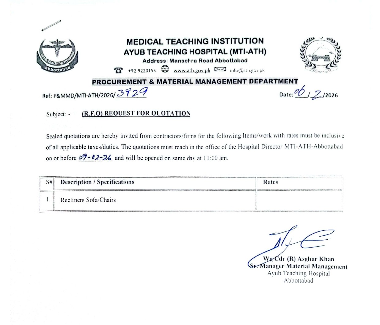 Category: tendersBy athFebruary 6, 2026 Author: ath Post navigationPreviousPrevious post:Technical Evaluation Report for the Tender of Repair, Modification and Upgradation of 25kg incinerator to 100 kg/CycleNextNext post:Request for Quotation for Crash Carts (Plastic Body) ImportedRelated PostsPrebid Meeting Minutes for the Tender of Lab Chemical Reagents on Rental BasisApril 3, 2026Minutes of Pre-Bid Meeting of Electro-Medical EquipmentApril 2, 2026Request for Quotation for Different Miscellaneous itemsMarch 27, 2026Bids are Invited from Firms / Bidders for Different Works & Items (Family Park, Lab Chemicals, Electro-Medical Equipment, Photostat Shop and Many More)March 23, 2026Request for Quotation for Repair of Air Compressor Dryer-IMarch 16, 2026Technical Evaluation Report Regarding Tender of Construction of Family ParkMarch 7, 2026