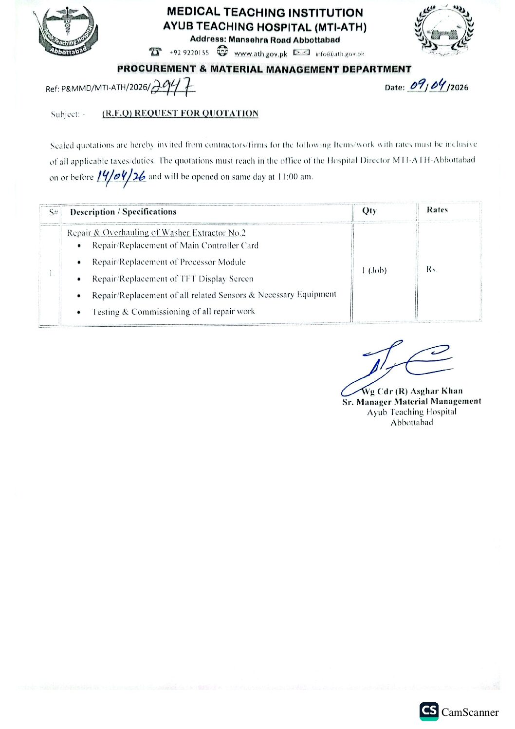 Category: tendersBy athApril 9, 2026 Author: ath Post navigationPreviousPrevious post:Applications are Invited from Suitable Candidate for the Position of Manager Security (IPS-06)NextNext post:Request for Quotation for Paper Delivery Rollers for HP 1102/1109/12a PrintersRelated PostsRequest for Quotation for Paper Delivery Rollers for HP 1102/1109/12a PrintersApril 9, 2026Prebid Meeting Minutes for the Tender of Lab Chemical Reagents on Rental BasisApril 3, 2026Minutes of Pre-Bid Meeting of Electro-Medical EquipmentApril 2, 2026Request for Quotation for Different Miscellaneous itemsMarch 27, 2026Bids are Invited from Firms / Bidders for Different Works & Items (Family Park, Lab Chemicals, Electro-Medical Equipment, Photostat Shop and Many More)March 23, 2026Request for Quotation for Repair of Air Compressor Dryer-IMarch 16, 2026