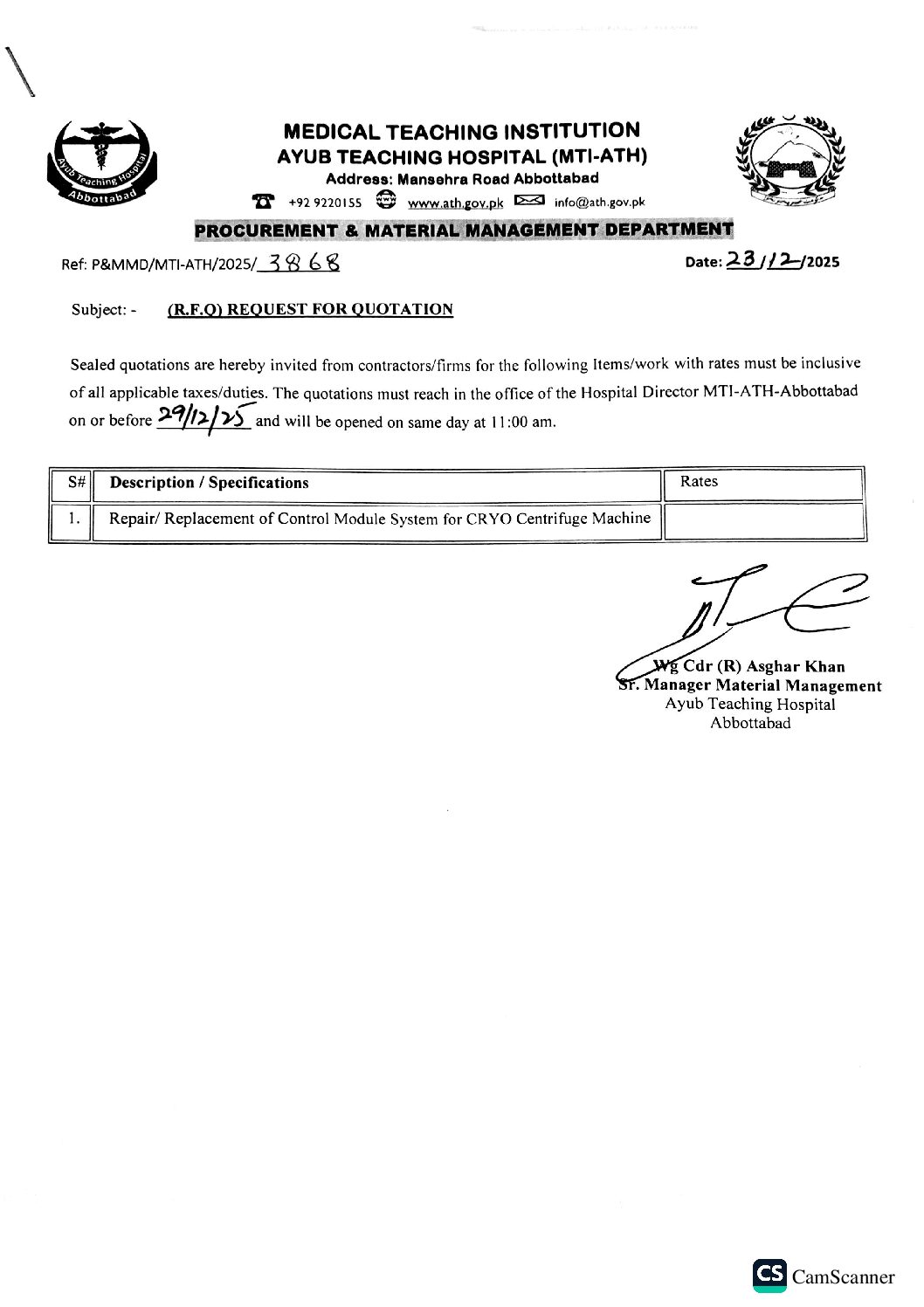 Category: tendersBy athDecember 24, 2025 Author: ath Post navigationPreviousPrevious post:Request for Quotation for Exhaust Fan (Motor Rewinding, Bearing Replacement, Shaft Adjustments, etc)NextNext post:Request for Quotation for ECG MachineRelated PostsRequest for Quotation for Set of Instruments for Septoplasty, Tracheostomy, Tonsillectomy, etcJanuary 20, 2026Request for Quotation for Installation of New Battery, Seat Covers (Ambulance & Bolan)January 20, 2026Request for Quotation for Performa for Instruction about Sehat Sahulat Program (SSP)January 20, 2026Request for Quotation for Admission Performa as per SampleJanuary 20, 2026Request for Quotation for Laundry Washing itemsJanuary 19, 2026Request for Quotation for Temperature & Humidity MeterJanuary 19, 2026