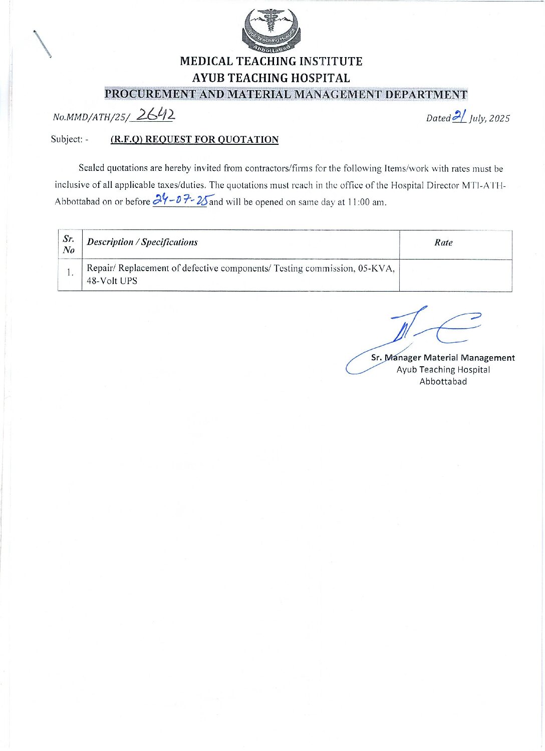 Category: tendersBy athJuly 21, 2025 Author: ath Post navigationPreviousPrevious post:Request for Quotation for Bronchoscope Bulb 15 Volt 150 WattNextNext post:Request for Quotation for Repair / Replacement of Parts of Jimny Jeep GK 982Related PostsRequest for Quotation for Set of Instruments for Septoplasty, Tracheostomy, Tonsillectomy, etcJanuary 20, 2026Request for Quotation for Installation of New Battery, Seat Covers (Ambulance & Bolan)January 20, 2026Request for Quotation for Performa for Instruction about Sehat Sahulat Program (SSP)January 20, 2026Request for Quotation for Admission Performa as per SampleJanuary 20, 2026Request for Quotation for Laundry Washing itemsJanuary 19, 2026Request for Quotation for Temperature & Humidity MeterJanuary 19, 2026