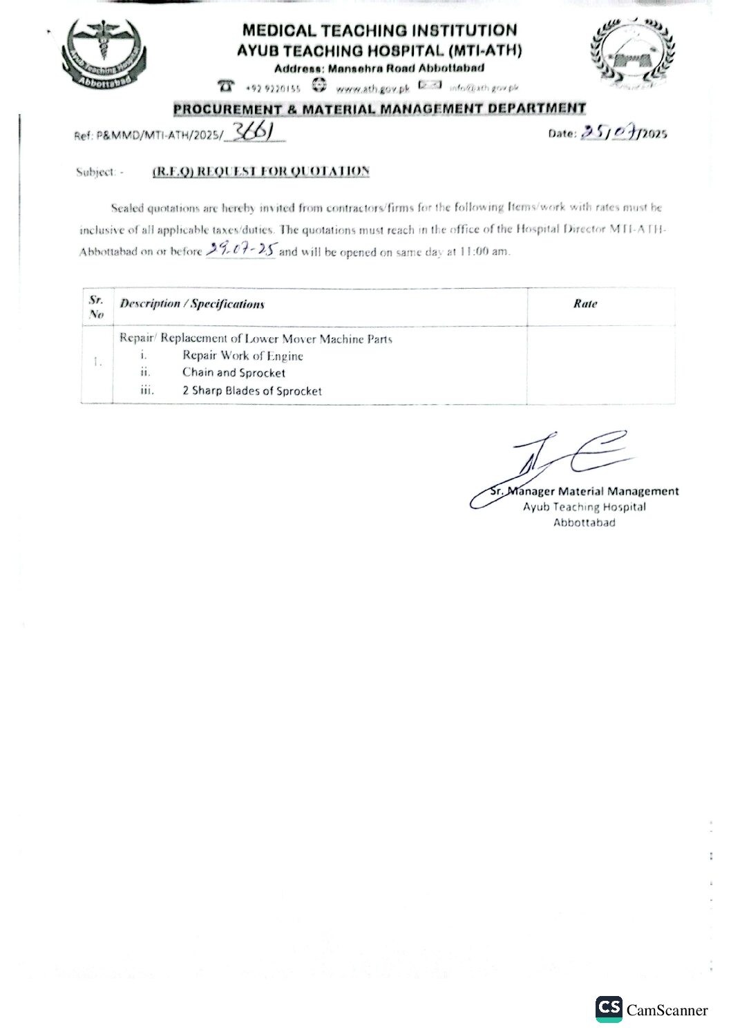 Category: tendersBy athJuly 25, 2025 Author: ath Post navigationPreviousPrevious post:Request for Quotation for Repair / Adjustment of TFT Screen and Main PCB BoardNextNext post:Request for Quotation for Fan Belt A-95Related PostsRequest for Quotation for Commercial Gas Meter, Guide Rail Shoe & Brake Leather PadNovember 7, 2025Request for Quotation for Insulator & Cable Jacket for 03 Core CableNovember 7, 2025Request for Quotation for Toner 151ANovember 7, 2025Request for Quotation for Centrifuge Machine 12 HolesNovember 7, 2025Request for Quotation for Repair & Upgradation of Digital Surveillance SystemNovember 6, 2025ATH invites bids for the Tender of Civil Works, IT Equipment & Consumable, CCTV, Repair/Modification of Incinerator, Servicing of VRF+DX System, Purchase of Cryogenic Oxygen tank and Lab Chemical Reagent on Rental BasisNovember 4, 2025