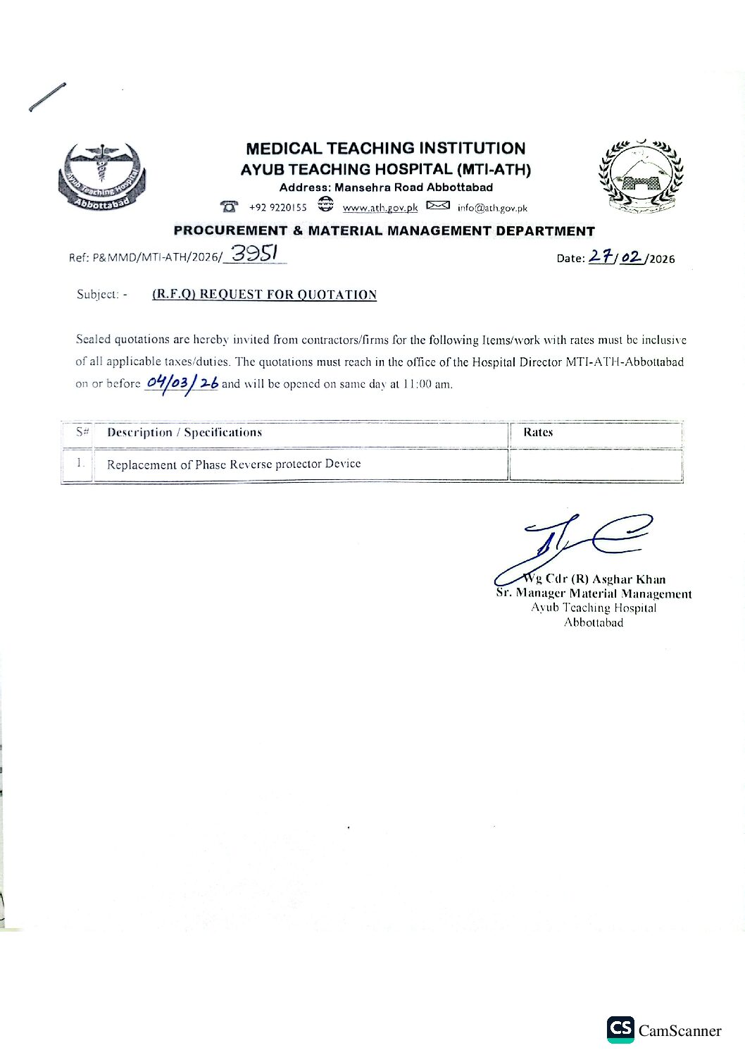 Request for Quotation for Replacement of Phase Reverse Protector Device