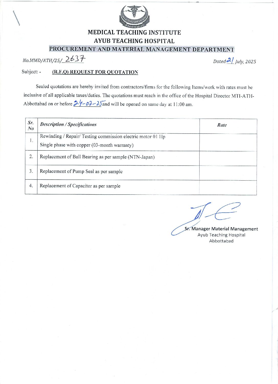 Category: tendersBy athJuly 21, 2025 Author: ath Post navigationPreviousPrevious post:Request for Quotation for HP-151 A Toner CartridgeNextNext post:Request for Quotation for Nut Bolt, Drill Bit UK, MS SocketRelated PostsRequest for Quotation for Repair of RefrigeratorApril 15, 2026Request for Quotation for Repair/Replacement Work of Lawn Mover and Bush Cutter MachinesApril 15, 2026Request for Quotation for Different Plants / FlowersApril 15, 2026Request for Quotation for Paper Delivery Rollers for HP 1102/1109/12a PrintersApril 9, 2026Request for Quotation for Repair & Overhauling of Washer Extractor No. 2April 9, 2026Prebid Meeting Minutes for the Tender of Lab Chemical Reagents on Rental BasisApril 3, 2026