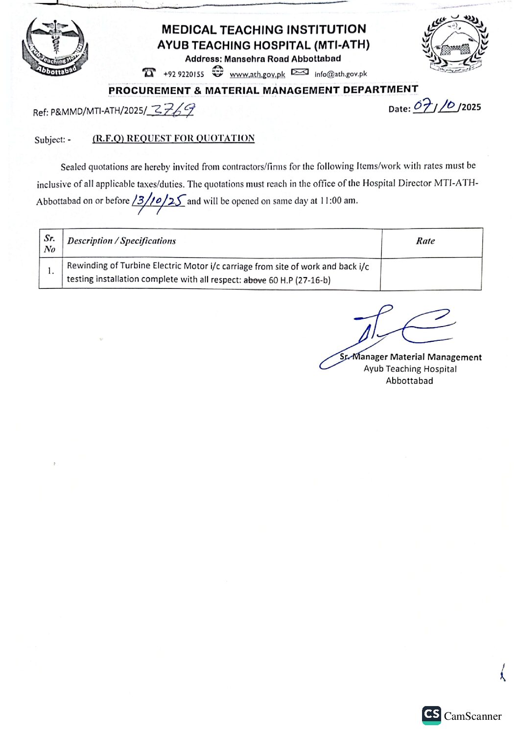 Category: tendersBy athOctober 8, 2025 Author: ath Post navigationPreviousPrevious post:Applications are invited from suitable candidates for the Post of Medical Director ATH AbbottabadNextNext post:Request for Quotation for Toner & Drum Unit for P5100DWRelated PostsRequest for Quotation for Commercial Gas Meter, Guide Rail Shoe & Brake Leather PadNovember 7, 2025Request for Quotation for Insulator & Cable Jacket for 03 Core CableNovember 7, 2025Request for Quotation for Toner 151ANovember 7, 2025Request for Quotation for Centrifuge Machine 12 HolesNovember 7, 2025Request for Quotation for Repair & Upgradation of Digital Surveillance SystemNovember 6, 2025ATH invites bids for the Tender of Civil Works, IT Equipment & Consumable, CCTV, Repair/Modification of Incinerator, Servicing of VRF+DX System, Purchase of Cryogenic Oxygen tank and Lab Chemical Reagent on Rental BasisNovember 4, 2025