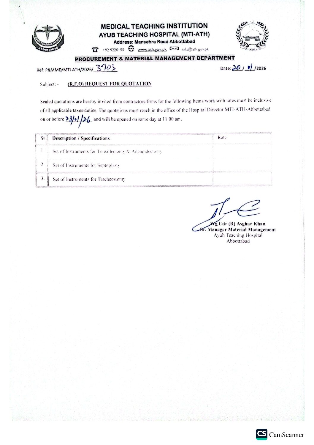 Category: tendersBy athJanuary 20, 2026 Author: ath Post navigationPreviousPrevious post:Request for Quotation for Installation of New Battery, Seat Covers (Ambulance & Bolan)NextNext post:Applications are invited from Suitable Candidates for the Positions of CHAIRPERSONSRelated PostsRequest for Quotation for Silicon Gun & Glass CatcherFebruary 16, 2026Request for Quotation for Circle Circuit & Bicarbonate Solution Mixture PlantFebruary 16, 2026Request for Quotation for Repairing of Office Chairs and Sofa SetFebruary 13, 2026Request for Quotation for Mobile OilsFebruary 9, 2026Request for Quotation for Heavy Duty Luggage Trolley (Iron Body)February 6, 2026Request for Quotation for Crash Carts (Plastic Body) ImportedFebruary 6, 2026