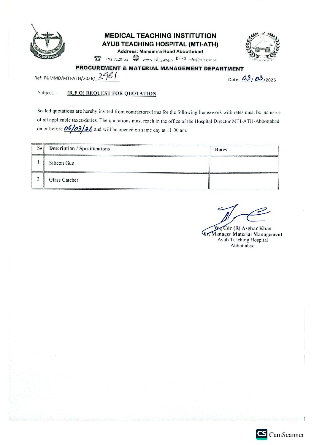 Category: tendersBy athMarch 3, 2026 Author: ath Post navigationPreviousPrevious post:Request for Quotation for Computer LED 24” (Branded)NextNext post:Request for Quotation for Bed Jack Complete, Gulli Hanges & Coaster Wheel 2″Related PostsPrebid Meeting Minutes for the Tender of Lab Chemical Reagents on Rental BasisApril 3, 2026Minutes of Pre-Bid Meeting of Electro-Medical EquipmentApril 2, 2026Request for Quotation for Different Miscellaneous itemsMarch 27, 2026Bids are Invited from Firms / Bidders for Different Works & Items (Family Park, Lab Chemicals, Electro-Medical Equipment, Photostat Shop and Many More)March 23, 2026Request for Quotation for Repair of Air Compressor Dryer-IMarch 16, 2026Technical Evaluation Report Regarding Tender of Construction of Family ParkMarch 7, 2026