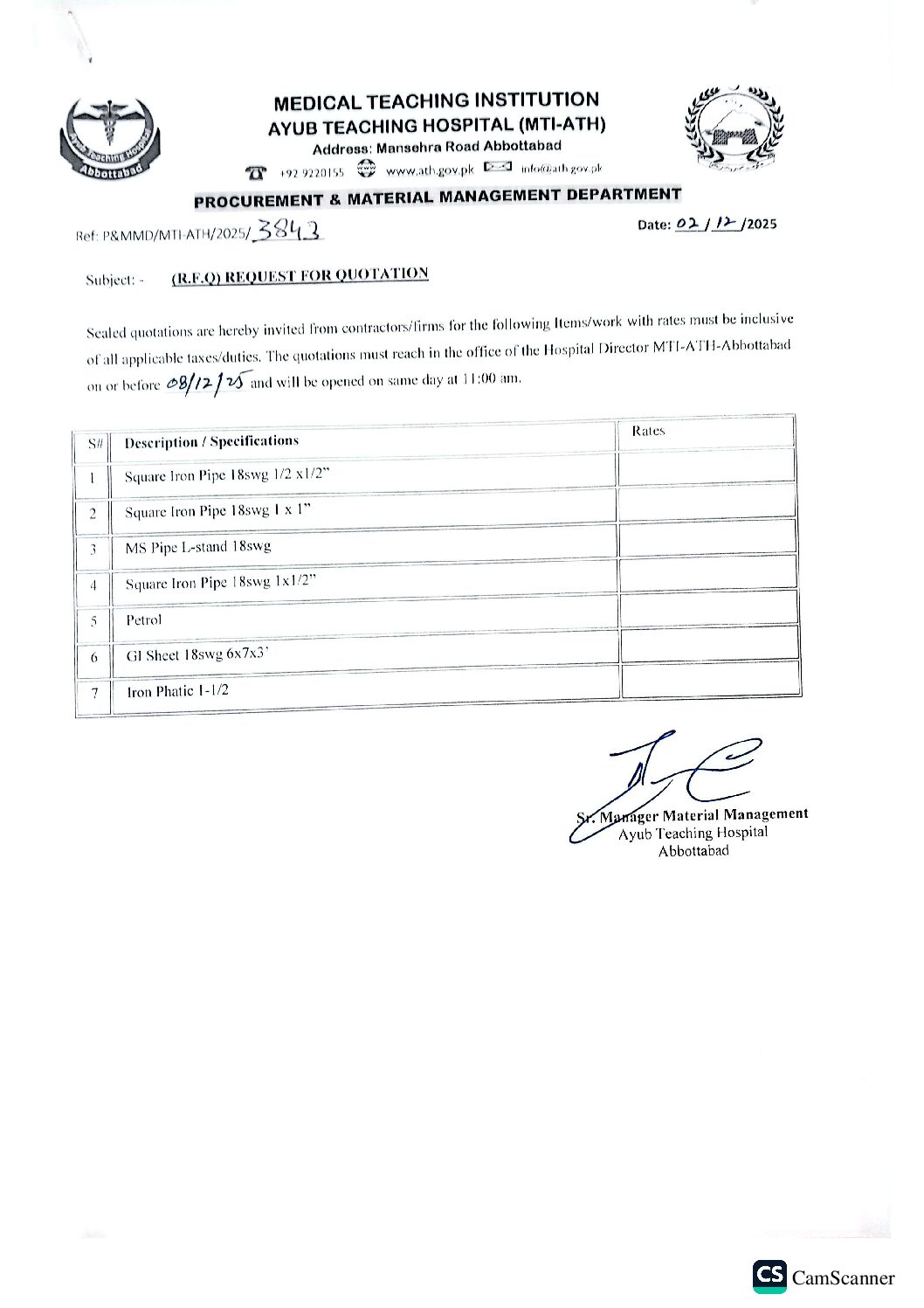 Category: tendersBy athDecember 2, 2025 Author: ath Post navigationPreviousPrevious post:Auction of Miscellaneous Items (Furniture, Iron, Vehicles, etc) on Dec 03, 2025 at Ayub Teaching HospitalNextNext post:Final Evaluation Report for the Tender of Surgical Disposable/Medical DevicesRelated PostsRequest for Quotation for Quartz Heater (SECO GM CLIMAX) Model SG-690December 12, 2025Request for Quotation for Bottom for Gas Geyser 18″, Regmaal Disc 4″December 10, 2025Request for Quotation for Flare Nuts for Air ConditionersDecember 10, 2025Request for Quotation for Steel Wire 3″, Acid, Disposable Safety Mask, Shovels, Pickaxes, Rope (Nylon), Suction Pump, Protective Clothing, BarsatiDecember 10, 2025Request for Quotation for AC & DC Relay for BMS AHU No.4December 10, 2025Request for Quotation for Looking Mirror 5mmDecember 10, 2025