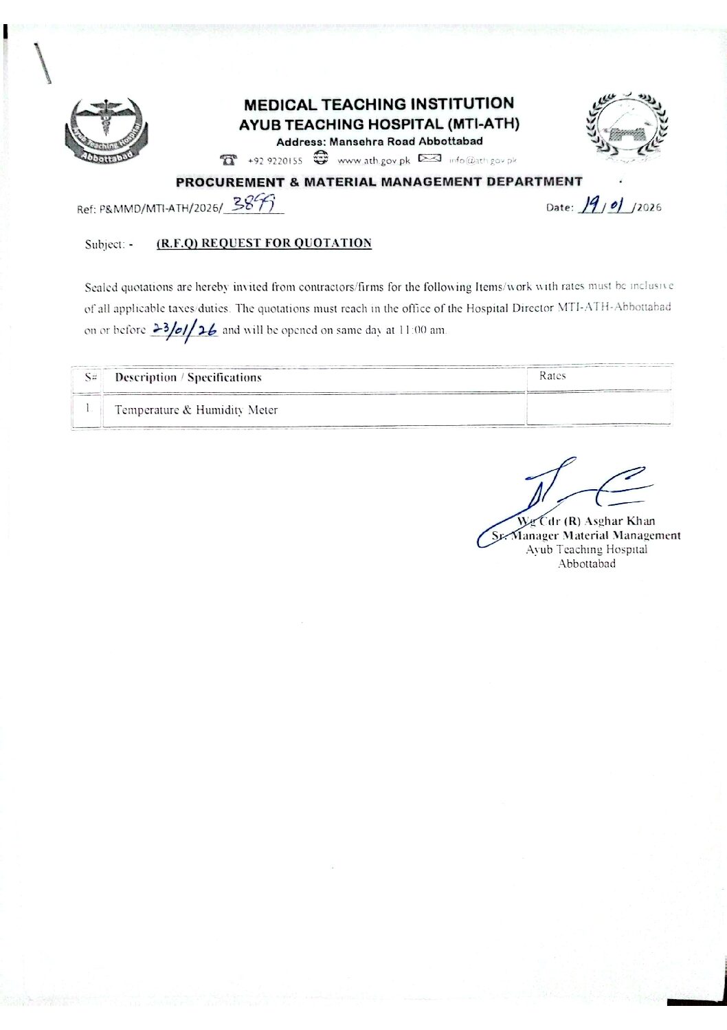 Category: tendersBy athJanuary 19, 2026 Author: ath Post navigationPreviousPrevious post:Walk-In Interview for the Post of Registered Nurse (IPS-04)NextNext post:Request for Quotation for Laundry Washing itemsRelated PostsRequest for Quotation for Silicon Gun & Glass CatcherFebruary 16, 2026Request for Quotation for Circle Circuit & Bicarbonate Solution Mixture PlantFebruary 16, 2026Request for Quotation for Repairing of Office Chairs and Sofa SetFebruary 13, 2026Request for Quotation for Mobile OilsFebruary 9, 2026Request for Quotation for Heavy Duty Luggage Trolley (Iron Body)February 6, 2026Request for Quotation for Crash Carts (Plastic Body) ImportedFebruary 6, 2026