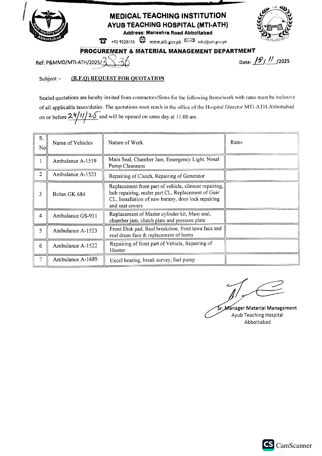 Category: tendersBy athNovember 18, 2025 Author: ath Post navigationPreviousPrevious post:Technical Evaluation Report for the Tender of Surgical Disposable/Medical DevicesNextNext post:Auction of Miscellaneous Items (Furniture, Iron, Vehicles, etc) on Dec 03, 2025 at Ayub Teaching HospitalRelated PostsRequest for Quotation for Set of Instruments for Septoplasty, Tracheostomy, Tonsillectomy, etcJanuary 20, 2026Request for Quotation for Installation of New Battery, Seat Covers (Ambulance & Bolan)January 20, 2026Request for Quotation for Performa for Instruction about Sehat Sahulat Program (SSP)January 20, 2026Request for Quotation for Admission Performa as per SampleJanuary 20, 2026Request for Quotation for Laundry Washing itemsJanuary 19, 2026Request for Quotation for Temperature & Humidity MeterJanuary 19, 2026